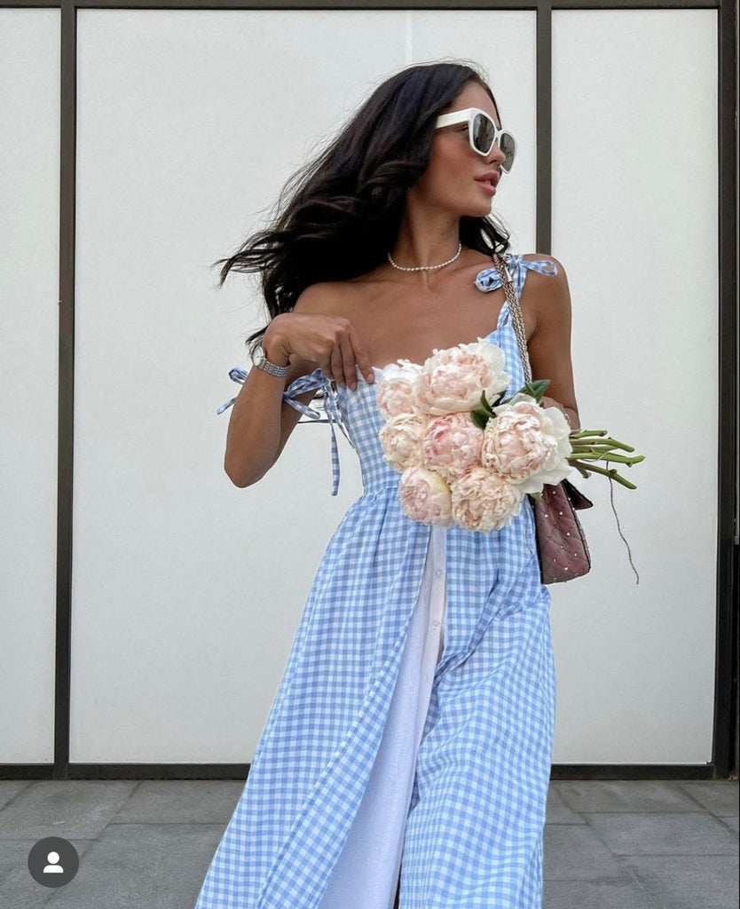 Šī kleita ir lieliski piemērotas karstām vasaras dienām, atvaļinājumiem un vēsākiem vakariem. Šīs kleita ir darināta no elpojoša kokvilnas auduma, ar smalkām lencītēm, kas eleganti sasienamas uz pleciem. Unikālā pogājama priekšpuse ļauj regulēt šķēlumu, nodrošinot personīgu komfortu un piešķirot individuālu stilu. Slāņainais svārku dizains ar rotaļīgu malu liek katram solim plūstoši līgoties. Mierīgajā debeszilajā tonī šī franču stila tējas kleita ir ideāls tērps pastaigām vai brīvdienu izbraucieniem.